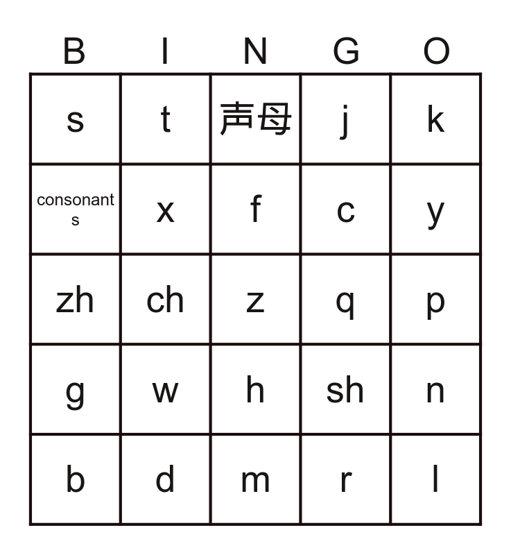 This bingo card has a free space and 24 words: b, w, f, r, k, s, t, 声母, q, p, zh, x, sh, n, consonant s, d, m, j, y, g, ch, h, c and l.