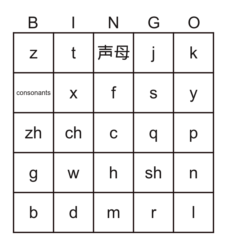 This bingo card has a free space and 24 words: b, w, f, r, k, z, t, 声母, q, p, zh, x, sh, n, consonants, d, m, j, y, g, ch, h, s and l.