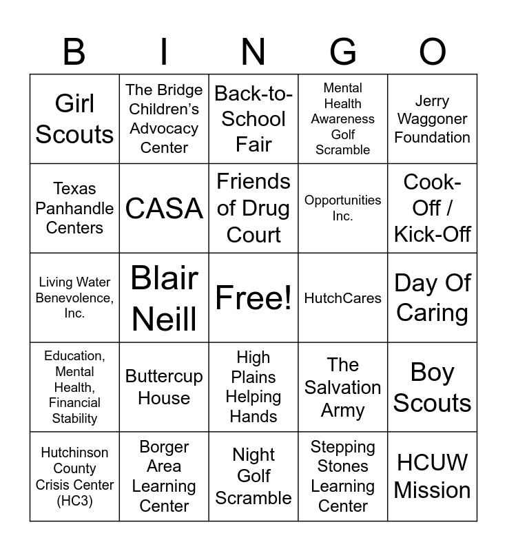 This bingo card has a free space and 24 words: Buttercup House, Borger Area Learning Center, Friends of Drug Court, Hutchinson County Crisis Center (HC3), Jerry Waggoner Foundation, Girl Scouts, Texas Panhandle Centers, The Bridge Children’s Advocacy Center, HutchCares, High Plains Helping Hands, Opportunities Inc., Living Water Benevolence, Inc., The Salvation Army, Boy Scouts, CASA, Stepping Stones Learning Center, Day Of Caring, Back-to-School Fair, Cook-Off / Kick-Off, Blair Neill, HCUW Mission, Education, Mental Health, Financial Stability, Mental Health Awareness Golf Scramble and Night Golf Scramble.