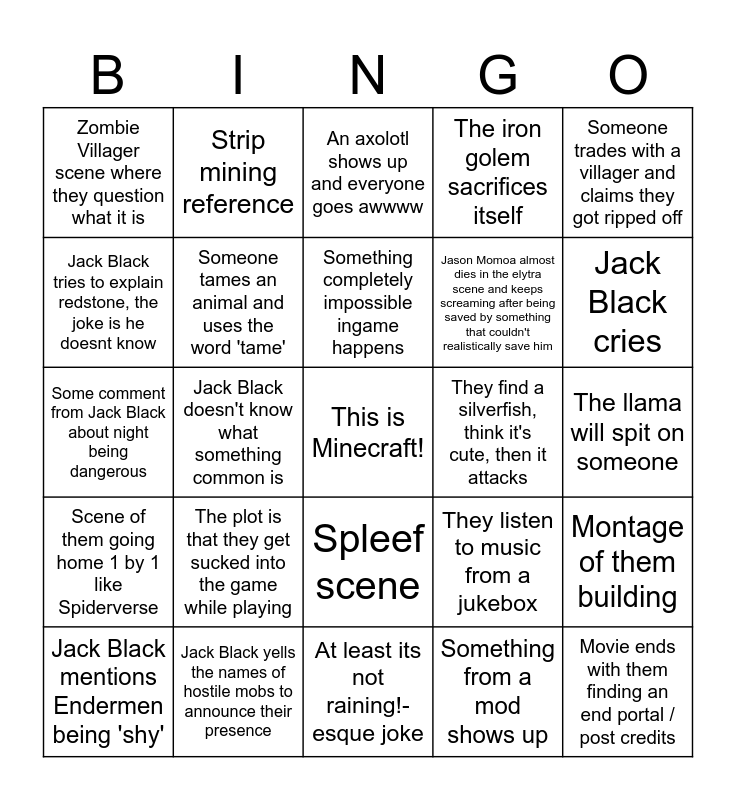 This bingo card has a free space and 24 words: Jack Black mentions Endermen being 'shy', The plot is that they get sucked into the game while playing, Something completely impossible ingame happens, Something from a mod shows up, Someone trades with a villager and claims they got ripped off, Zombie Villager scene where they question what it is, Strip mining reference, An axolotl shows up and everyone goes awwww, They find a silverfish, think it's cute, then it attacks, The llama will spit on someone, Some comment from Jack Black about night being dangerous, Someone tames an animal and uses the word 'tame', They listen to music from a jukebox, Montage of them building, Jack Black tries to explain redstone, the joke is he doesnt know, Jack Black yells the names of hostile mobs to announce their presence, At least its not raining!-esque joke, The iron golem sacrifices itself, Jack Black cries, Scene of them going home 1 by 1 like Spiderverse, Jack Black doesn't know what something common is, Spleef scene, Jason Momoa almost dies in the elytra scene and keeps screaming after being saved by something that couldn't realistically save him and Movie ends with them finding an end portal / post credits.