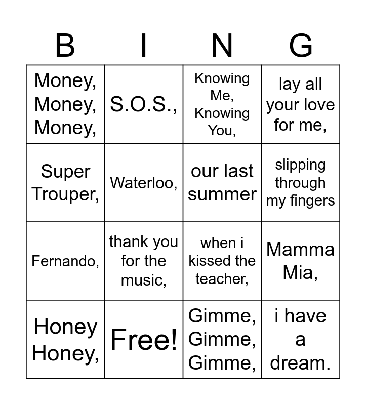 This bingo card has 16 words: Free!, Mamma Mia,, Knowing Me, Knowing You,, Money, Money, Money,, Fernando,, S.O.S.,, when i kissed the teacher,, Gimme, Gimme, Gimme,, Super Trouper,, Waterloo,, Honey Honey,, lay all your love for me,, thank you for the music,, slipping through my fingers, our last summer and i have a dream..