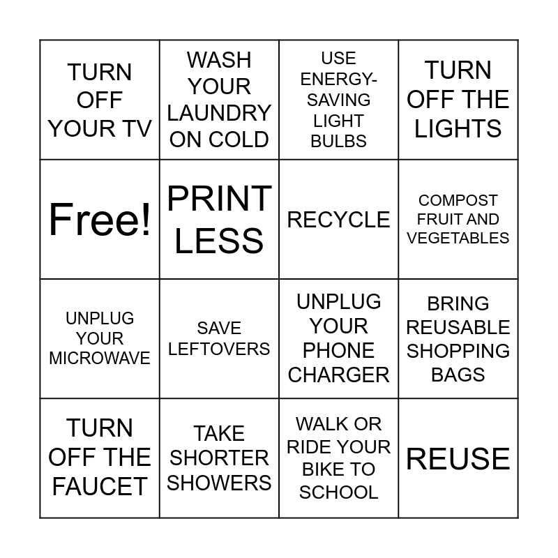 This bingo card has 16 words: TAKE SHORTER SHOWERS, BRING REUSABLE SHOPPING BAGS, USE ENERGY-SAVING LIGHT BULBS, TURN OFF YOUR TV, UNPLUG YOUR MICROWAVE, WASH YOUR LAUNDRY ON COLD, UNPLUG YOUR PHONE CHARGER, WALK OR RIDE YOUR BIKE TO SCHOOL, Free!, PRINT LESS, TURN OFF THE FAUCET, TURN OFF THE LIGHTS, SAVE LEFTOVERS, COMPOST FRUIT AND VEGETABLES, RECYCLE and REUSE.