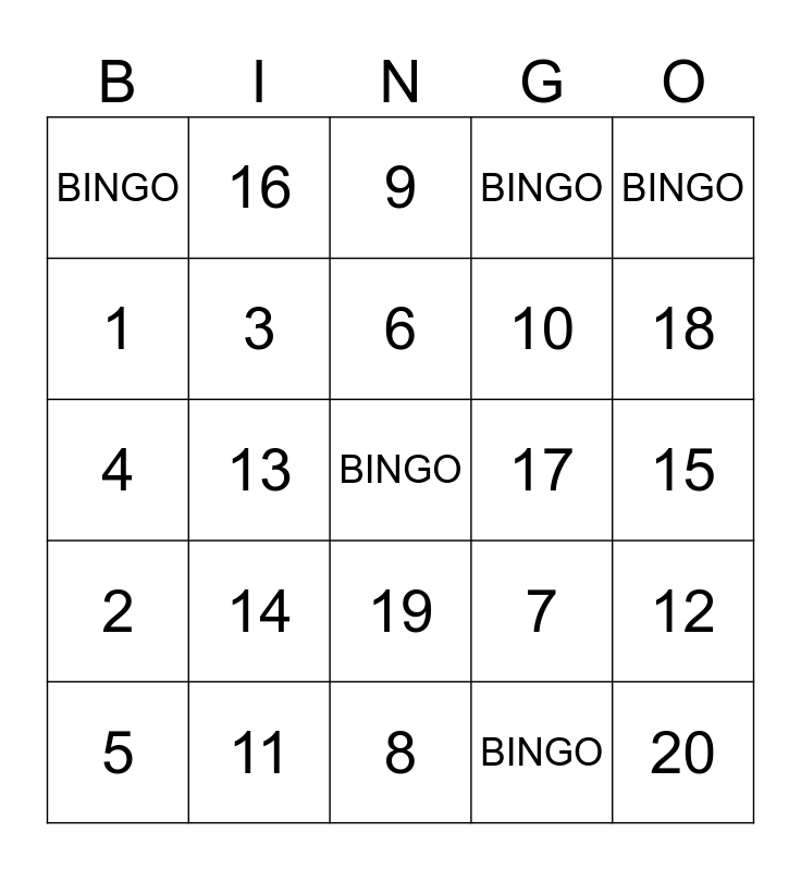 This bingo card has a free space and 24 words: 14, 11, 6, 5, BINGO, BINGO, 1, 16, 17, 19, 10, 4, 7, 12, 3, BINGO, 15, 9, 18, 13, 20, 2, BINGO and 8.