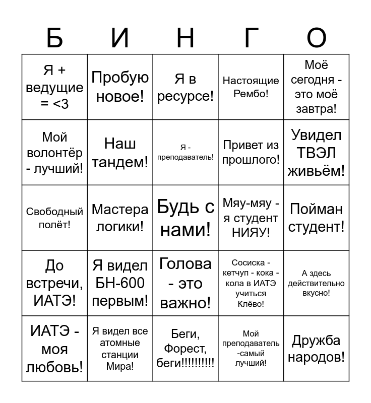 This bingo card has a free space and 24 words: Я видел БН-600 первым!, Я видел все атомные станции Мира!, Я - преподаватель!, ИАТЭ - моя любовь!, Моё сегодня - это моё завтра!, Я + ведущие = <3, Мой волонтёр - лучший!, Пробую новое!, Мяу-мяу - я студент НИЯУ!, Голова - это важно!, Привет из прошлого!, Свободный полёт!, Сосиска - кетчуп - кока - кола в ИАТЭ учиться Клёво!, А здесь действительно вкусно!, Наш тандем!, Мой преподаватель -самый лучший!, Пойман студент!, Я в ресурсе!, Увидел ТВЭЛ живьём!, Мастера логики!, Дружба народов!, До встречи, ИАТЭ!, Настоящие Рембо! and Беги, Форест, беги!!!!!!!!!!.