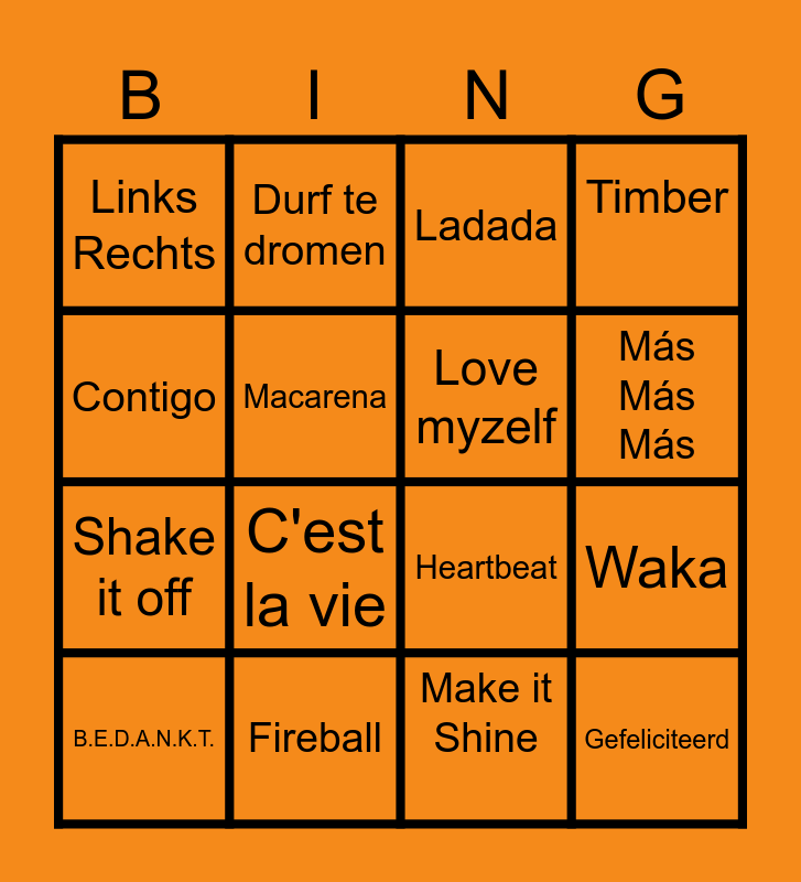 This bingo card has 21 words: Fireball, Vreemde eend, Durf te dromen, Huisfeestje, Make it Shine, Love myzelf, Links Rechts, Ladada, Heartbeat, Más Más Más, Shake it off, Timber, Gefeliciteerd, Alles op gevoel, Macarena, Pizzalied, B.E.D.A.N.K.T., C'est la vie, Contigo, Waka and Ga dan!.