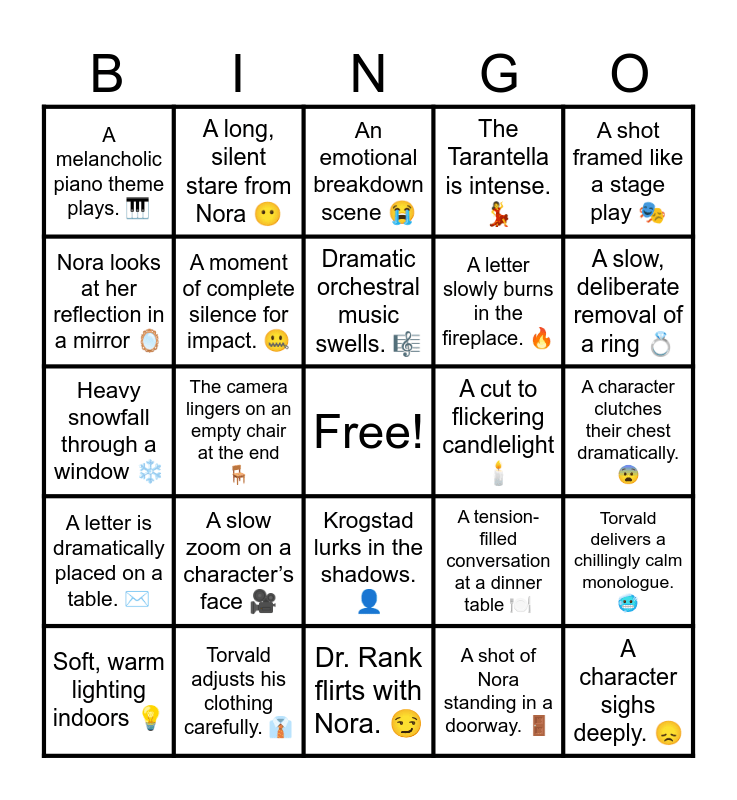 This bingo card has a free space and 24 words: A slow zoom on a characterβs face π₯, Torvald adjusts his clothing carefully. π, Dramatic orchestral music swells. πΌ, Soft, warm lighting indoors π‘, A shot framed like a stage play π, A melancholic piano theme plays. πΉ, Nora looks at her reflection in a mirror πͺ, A long, silent stare from Nora πΆ, A cut to flickering candlelight π―οΈ, Krogstad lurks in the shadows. π€, A letter slowly burns in the fireplace. π₯, Heavy snowfall through a window βοΈ, A tension-filled conversation at a dinner table π½οΈ, Torvald delivers a chillingly calm monologue. π₯Ά, A moment of complete silence for impact. π€, A shot of Nora standing in a doorway. πͺ, A character clutches their chest dramatically. π¨, An emotional breakdown scene π, A slow, deliberate removal of a ring π, The camera lingers on an empty chair at the end πͺ, A character sighs deeply. π, A letter is dramatically placed on a table. βοΈ, The Tarantella is intense. π and Dr. Rank flirts with Nora. π.
