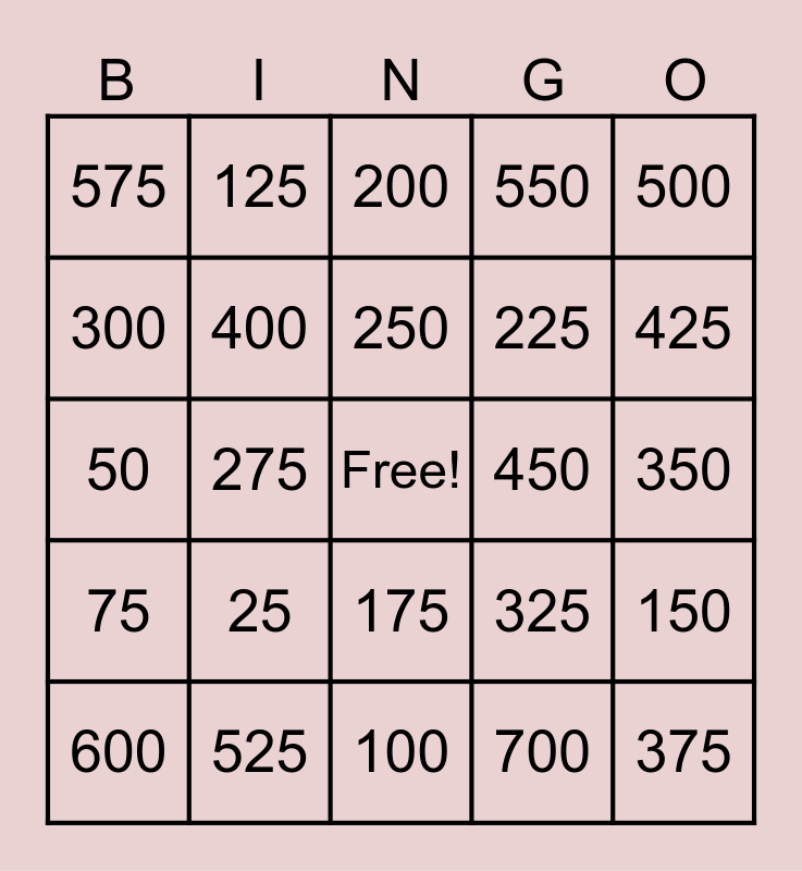 This bingo card has a free space and 25 words: 25, 100, 250, 600, 500, 575, 300, 125, 450, 175, 225, 50, 325, 150, 400, 475, 350, 200, 425, 275, 375, 525, 75, 550 and 700.