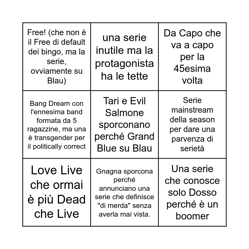 This bingo card has 9 words: Love Live che ormai è più Dead che Live, Da Capo che va a capo per la 45esima volta, una serie inutile ma la protagonista ha le tette, Bang Dream con l'ennesima band formata da 5 ragazzine, ma una è transgender per il politically correct, Free! (che non è il Free di default dei bingo, ma la serie, ovviamente su Blau), Serie mainstream della season per dare una parvenza di serietà, Tari e Evil Salmone sporconano perché Grand Blue su Blau, Una serie che conosce solo Dosso perché è un boomer and Gnagna sporcona perché annunciano una serie che definisce "di merda" senza averla mai vista..