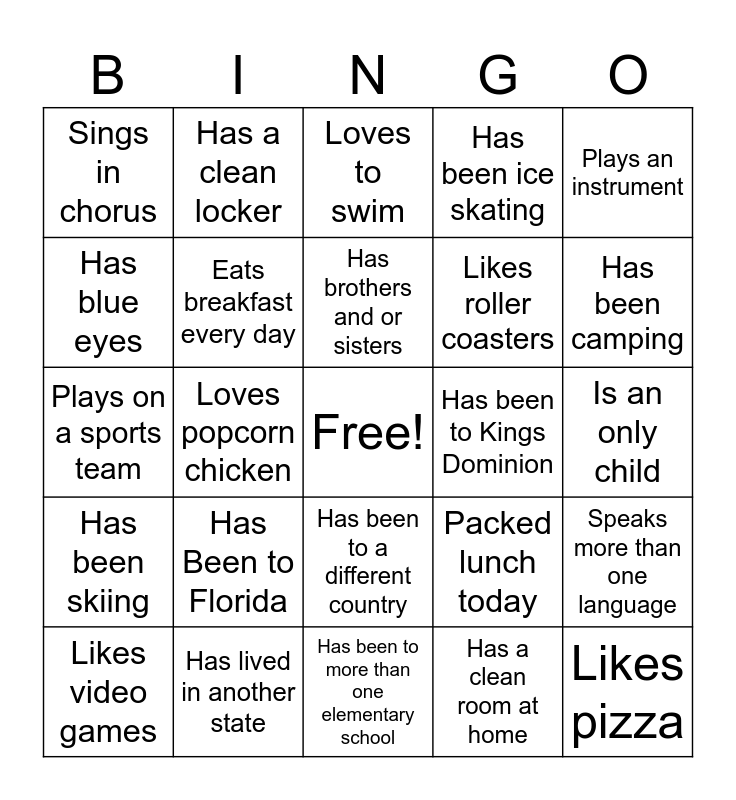 This bingo card has a free space and 24 words: Has Been to Florida, Has lived in another state, Has brothers and or sisters, Likes video games, Plays an instrument, Sings in chorus, Has blue eyes, Has a clean locker, Has been to Kings Dominion, Has been to a different country, Likes roller coasters, Plays on a sports team, Packed lunch today, Speaks more than one language, Eats breakfast every day, Has a clean room at home, Is an only child, Loves to swim, Has been camping, Loves popcorn chicken, Likes pizza, Has been skiing, Has been ice skating and Has been to more than one elementary school.