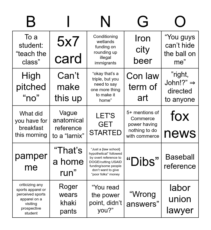 This bingo card has a free space and 37 words: Sonic boom of “let’s get started” (maybe this goes in the middle so everyone gets it), Same jokes every year, you guys gotta give me a laugh, Can’t make this up, Baseball reference, “That’s a home run”, “okay that’s a triple, but you need to say one more thing to make it home”, If you don’t understand that, I need a hand right now., “You guys can’t hide the ball on me”, Make my day Hartley., Vague anatomical reference to a “larnix”, Iron city beer, labor union lawyer, fox news, High pitched “no”, pamper me, some people don’t think parents should be able to get healthcare for their children, Conditioning wetlands funding on rounding up illegal immigrants, “Just a [law school] hypothetical” followed by overt reference to DOGE/cutting USAID funding/some people don’t want to give “poor folks” money, 5+ mentions of Commerce power having nothing to do with commerce, To a student: “teach the class”, ”right, John!?” ⇒ directed to anyone, criticizing any sports apparel or perceived sports apparel on a visiting prospective student, “You read the power point, didn’t you?”, Andrea “aced the class”, “Wrong answers”, 5x7 card, “New sentence”, Wednesdee, perches on the desk on the far side with his legs crossed, Having trouble hearing you / Speak louder, Roger wears khaki pants, What did you have for breakfast this morning, Repeat that because it was so perfect, “Dibs”, Con law term of art and Twilight zone ghost noise.