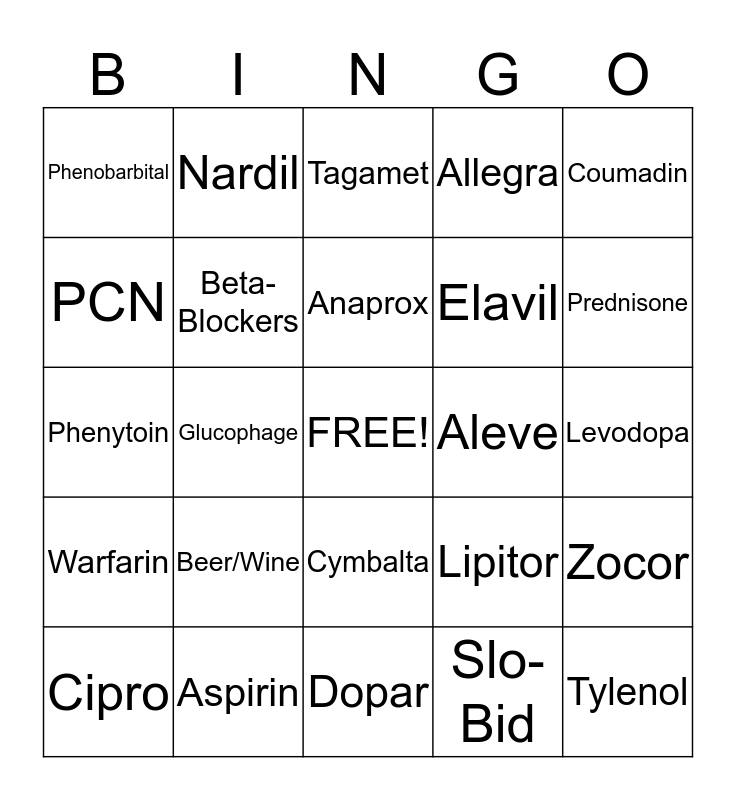 This bingo card has a free space and 24 words: Beer/Wine, Aspirin, Anaprox, Cipro, Coumadin, Phenobarbital, PCN, Nardil, Aleve, Cymbalta, Elavil, Phenytoin, Lipitor, Zocor, Beta-Blockers, Slo-Bid, Levodopa, Tagamet, Prednisone, Glucophage, Tylenol, Warfarin, Allegra and Dopar.