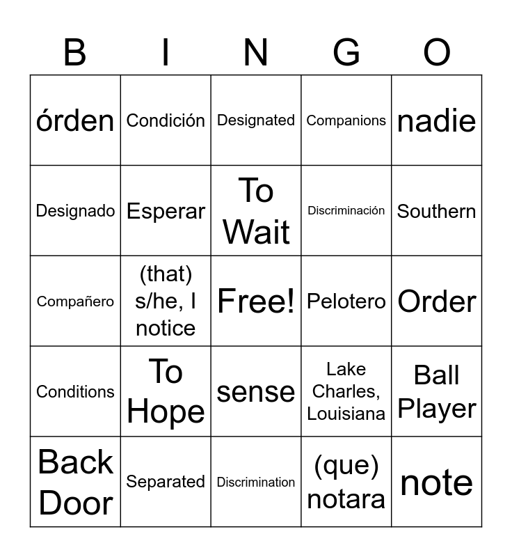 This bingo card has a free space and 27 words: Lake Charles, Louisiana, Cocoa, Florida, Discriminación, Discrimination, Designado, Designated, Condición, Conditions, Pelotero, Ball Player, Compañero, Companions, Back Door, Separated, Southern, Felipe Alou, Esperar, To Wait, To Hope, órden, Order, (que) notara, (that) s/he, I notice, note, sense, nadie and no one.