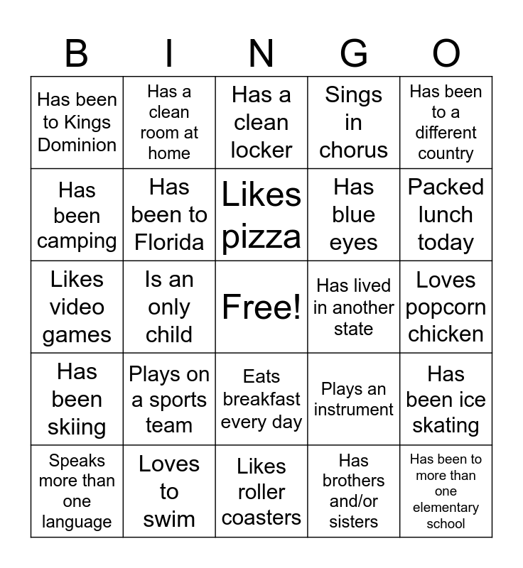 This bingo card has a free space and 24 words: Plays on a sports team, Loves to swim, Likes pizza, Speaks more than one language, Has been to a different country, Has been to Kings Dominion, Has been camping, Has a clean room at home, Has lived in another state, Eats breakfast every day, Has blue eyes, Likes video games, Plays an instrument, Has been ice skating, Has been to Florida, Has brothers and/or sisters, Loves popcorn chicken, Has a clean locker, Packed lunch today, Is an only child, Has been to more than one elementary school, Has been skiing, Sings in chorus and Likes roller coasters.