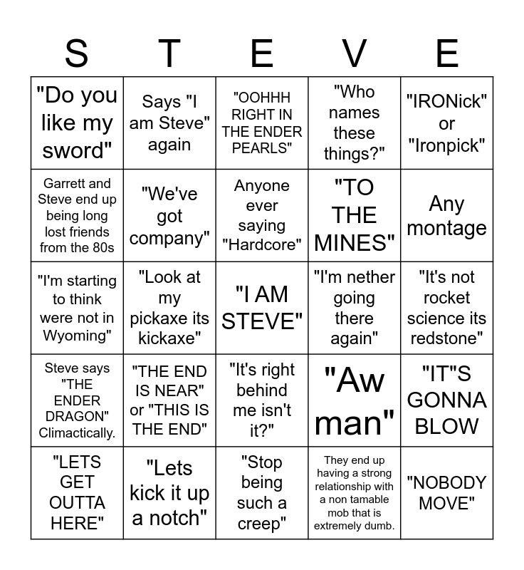 This bingo card has a free space and 24 words: "LETS GET OUTTA HERE", "THE END IS NEAR" or "THIS IS THE END", Anyone ever saying "Hardcore", They end up having a strong relationship with a non tamable mob that is extremely dumb., "IRONick" or "Ironpick", "Do you like my sword", Says "I am Steve" again, "OOHHH RIGHT IN THE ENDER PEARLS", "I'm nether going there again", "It's not rocket science its redstone", "I'm starting to think were not in Wyoming", "We've got company", "Aw man", "IT"S GONNA BLOW, Garrett and Steve end up being long lost friends from the 80s, "Lets kick it up a notch", "Stop being such a creep", "Who names these things?", Any montage, Steve says "THE ENDER DRAGON" Climactically., "Look at my pickaxe its kickaxe", "It's right behind me isn't it?", "TO THE MINES" and "NOBODY MOVE".
