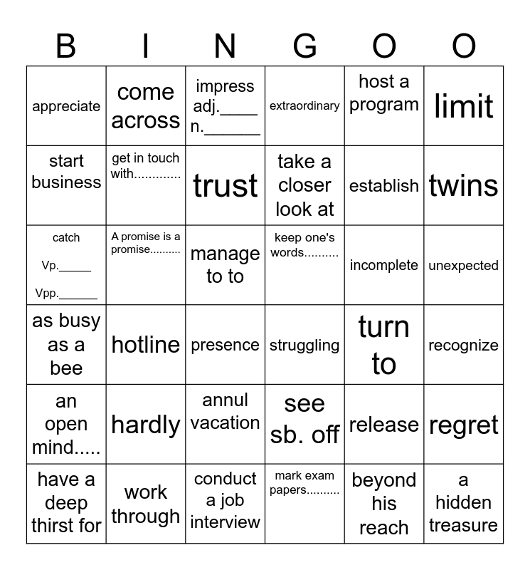 This bingo card has 36 words: see sb. off, annul vacation, mark exam papers.........., start business, as busy as a bee, keep one's words.........., get in touch with............., conduct a job interview, host a program, release, twins, extraordinary, regret, A promise is a promise.........., take a closer look at, appreciate, an open mind....., incomplete, catch Vp._____ Vpp.______, impress adj.____ n.______, manage to to, hotline, struggling, presence, turn to, come across, establish, work through, trust, limit, a hidden treasure, have a deep thirst for, recognize, unexpected, hardly and beyond his reach.
