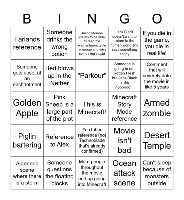 This bingo card has a free space and 24 words: Reference to Alex, Someone questions the floating blocks, "Parkour", A generic scene where there is a storm, If you die in the game, you die in real life!, Farlands reference, Someone gets upset at an enchantment, Someone drinks the wrong potion, Minecraft Story Mode reference, YouTuber reference (not Technoblade that's already confirmed), Someone is going to eat Rotten Flesh but Jack Black is like noooooo!!!, Golden Apple, Movie isn't bad, Desert Temple, Bed blows up in the Nether, Ocean attack scene, Armed zombie, Jason Momoa claims to be able to read the enchantment table language and says something stupid, Comment that will severely date the movie in like 5 years, Pink Sheep is a large part of the plot, Can't sleep because of monsters outside, Piglin bartering, Jack Black doesn't want to return to the human world and says something sappy and More people throughout the movie end up going into Minecraft.