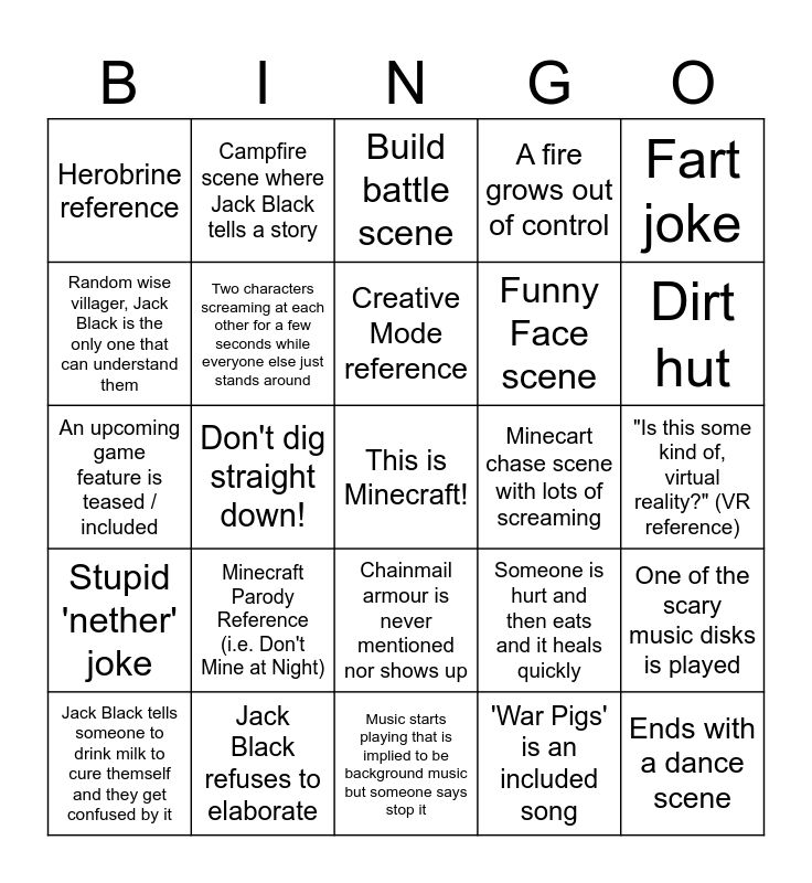 This bingo card has a free space and 24 words: Minecraft Parody Reference (i.e. Don't Mine at Night), Jack Black refuses to elaborate, Creative Mode reference, Jack Black tells someone to drink milk to cure themself and they get confused by it, Fart joke, Herobrine reference, Random wise villager, Jack Black is the only one that can understand them, Campfire scene where Jack Black tells a story, Minecart chase scene with lots of screaming, Chainmail armour is never mentioned nor shows up, Funny Face scene, An upcoming game feature is teased / included, Someone is hurt and then eats and it heals quickly, One of the scary music disks is played, Two characters screaming at each other for a few seconds while everyone else just stands around, 'War Pigs' is an included song, "Is this some kind of, virtual reality?" (VR reference), Build battle scene, Dirt hut, Don't dig straight down!, Ends with a dance scene, Stupid 'nether' joke, A fire grows out of control and Music starts playing that is implied to be background music but someone says stop it.