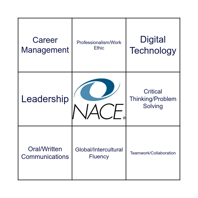 This bingo card has a free space and 8 words: Critical Thinking/Problem Solving, Digital Technology, Professionalism/Work Ethic, Oral/Written Communications, Career Management, Teamwork/Collaboration, Leadership and Global/Intercultural Fluency.