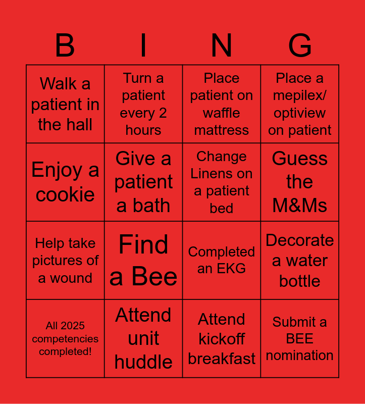 This bingo card has 16 words: Attend unit huddle, Decorate a water bottle, Place patient on waffle mattress, Walk a patient in the hall, Help take pictures of a wound, Turn a patient every 2 hours, Completed an EKG, Attend kickoff breakfast, Enjoy a cookie, Give a patient a bath, All 2025 competencies completed!, Place a mepilex/ optiview on patient, Find a Bee, Guess the M&Ms, Change Linens on a patient bed and Submit a BEE nomination.