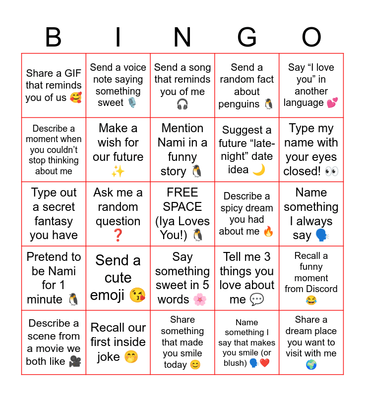 This bingo card has a free space and 24 words: Send a cute emoji π, Recall our first inside joke π€, Mention Nami in a funny story π§, Describe a scene from a movie we both like π₯, Say βI love youβ in another language π, Share a GIF that reminds you of us π₯°, Describe a moment when you couldnβt stop thinking about me, Send a voice note saying something sweet ποΈ, Describe a spicy dream you had about me π₯, Say something sweet in 5 words πΈ, Suggest a future βlate-nightβ date idea π, Type out a secret fantasy you have, Tell me 3 things you love about me π¬, Recall a funny moment from Discord π, Make a wish for our future β¨, Name something I say that makes you smile (or blush) π£οΈβ€οΈ, Name something I always say π£οΈ, Send a song that reminds you of me π§, Type my name with your eyes closed! π, Ask me a random question β, Share a dream place you want to visit with me π, Pretend to be Nami for 1 minute π§, Send a random fact about penguins π§ and Share something that made you smile today π.