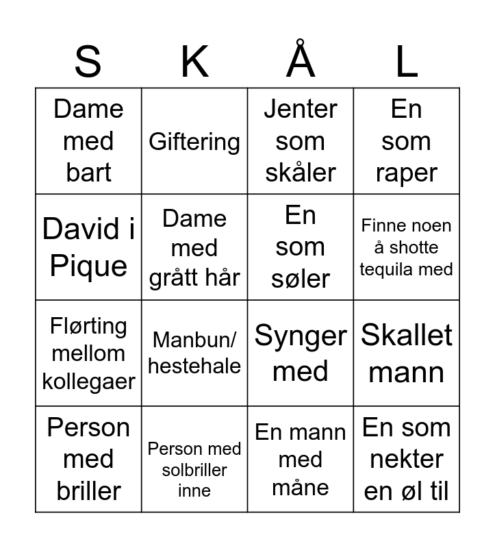 This bingo card has 16 words: Person med solbriller inne, Skallet mann, Jenter som skåler, Dame med bart, Flørting mellom kollegaer, Giftering, Synger med, En mann med måne, David i Pique, Dame med grått hår, Person med briller, En som raper, Manbun/ hestehale, Finne noen å shotte tequila med, En som søler and En som nekter en øl til.