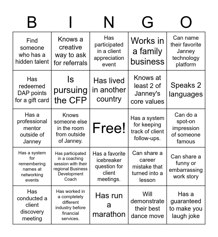 This bingo card has a free space and 30 words: Has worked in a completely different industry before financial services., Can explain their personal value proposition in 30 seconds., Knows someone else in the room from outside of Janney., Has a go-to podcast, book, or resource for professional growth, Find someone who has a hidden talent, Has participated in a client appreciation event, Is pursuing the CFP, Has a favorite icebreaker question for client meetings., Has a system for keeping track of client follow-ups., Has run a marathon, Can do a spot-on impression of someone famous, Has a guaranteed to make you laugh joke, Will demonstrate their best dance move, Can share a client success story that surprised them, Speaks 2 languages, Has every cold-called someone who became a major client, Can share a career mistake that turned into a lesson, Has a system for remembering names at networking events, Has participated in a coaching session with their regional Business Development Coach, Can name their favorite Janney technology platform, Has a professional mentor outside of Janney, Can share a strategy they use to stay motivated, Knows a creative way to ask for referrals, Knows at least 2 of Janney's core values, Has redeemed DAP points for a gift card, Works in a family business, Can share a funny or embarrassing work story, Has conducted a client discovery meeting, Has lived in another country and Has a creative way of simplifying complex financial concepts for clients.