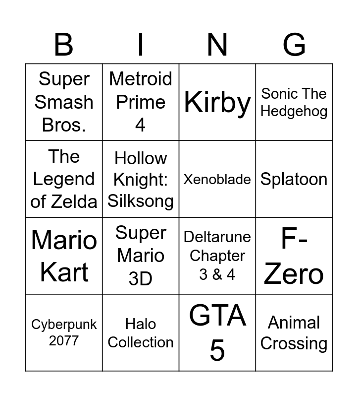This bingo card has 16 words: Halo Collection, F-Zero, Kirby, Super Smash Bros., Mario Kart, Metroid Prime 4, Deltarune Chapter 3 & 4, GTA 5, The Legend of Zelda, Hollow Knight: Silksong, Cyberpunk 2077, Sonic The Hedgehog, Super Mario 3D, Splatoon, Xenoblade and Animal Crossing.