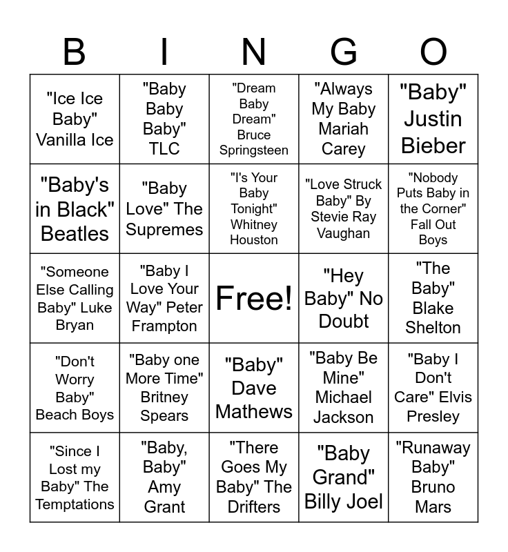 This bingo card has a free space and 24 words: "Baby one More Time" Britney Spears, "Baby, Baby" Amy Grant, "I's Your Baby Tonight" Whitney Houston, "Since I Lost my Baby" The Temptations, "Baby" Justin Bieber, "Ice Ice Baby" Vanilla Ice, "Baby's in Black" Beatles, "Baby Baby Baby" TLC, "Hey Baby" No Doubt, "Baby" Dave Mathews, "Love Struck Baby" By Stevie Ray Vaughan, "Someone Else Calling Baby" Luke Bryan, "Baby Be Mine" Michael Jackson, "Baby I Don't Care" Elvis Presley, "Baby Love" The Supremes, "Baby Grand" Billy Joel, "The Baby" Blake Shelton, "Dream Baby Dream" Bruce Springsteen, "Nobody Puts Baby in the Corner" Fall Out Boys, "Baby I Love Your Way" Peter Frampton, "Runaway Baby" Bruno Mars, "Don't Worry Baby" Beach Boys, "Always My Baby Mariah Carey and "There Goes My Baby" The Drifters.