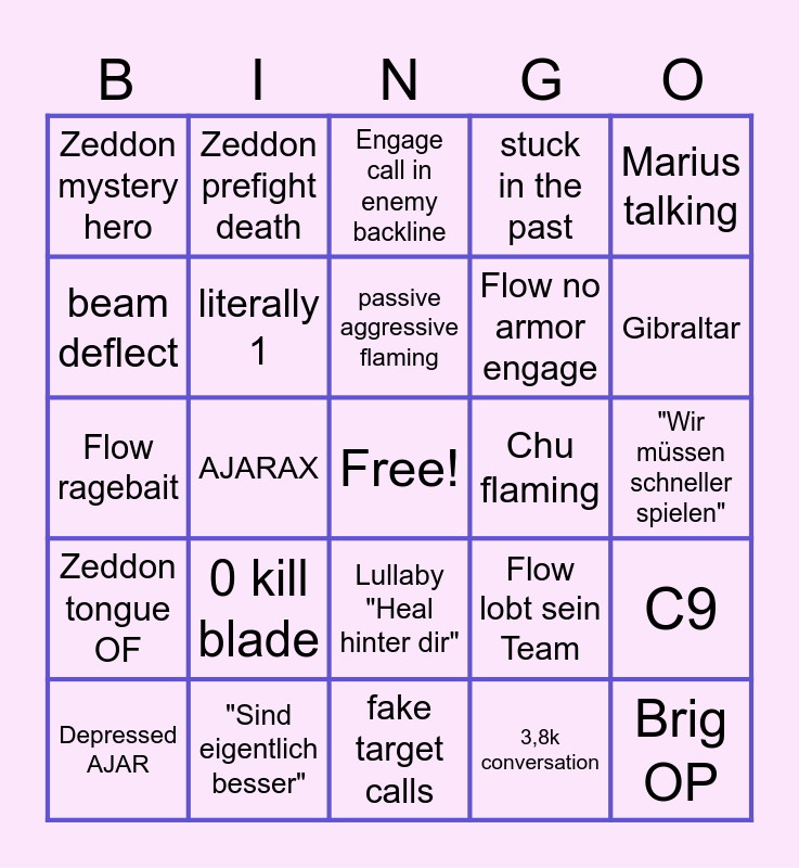 This bingo card has a free space and 25 words: 0 kill blade, fake target calls, passive aggressive flaming, Depressed AJAR, Marius talking, Zeddon mystery hero, beam deflect, Zeddon prefight death, Chu flaming, Lullaby "Heal hinter dir", Flow no armor engage, Flow ragebait, Flow lobt sein Team, C9, literally 1, Zeddon abandoning objective, "Wir müssen schneller spielen", Engage call in enemy backline, Gibraltar, AJARAX, Brig OP, "Sind eigentlich besser", Zeddon tongue OF, stuck in the past and 3,8k conversation.