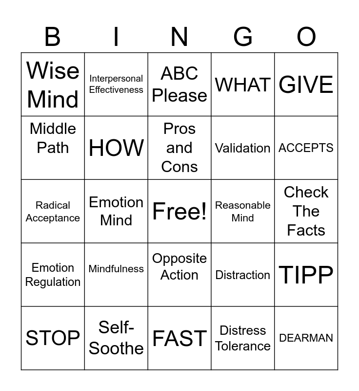 This bingo card has a free space and 24 words: Mindfulness, Self-Soothe, Pros and Cons, STOP, GIVE, Wise Mind, Middle Path, Interpersonal Effectiveness, Reasonable Mind, Opposite Action, Validation, Radical Acceptance, Distraction, TIPP, HOW, Distress Tolerance, Check The Facts, ABC Please, ACCEPTS, Emotion Mind, DEARMAN, Emotion Regulation, WHAT and FAST.