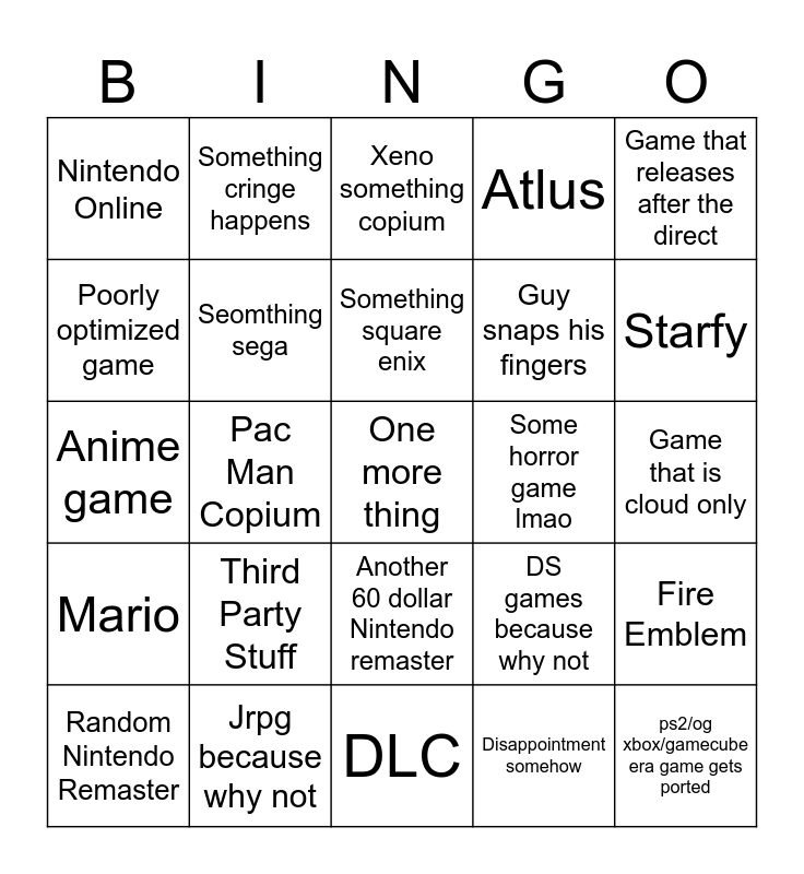 This bingo card has a free space and 24 words: Third Party Stuff, Jrpg because why not, Something square enix, Random Nintendo Remaster, Game that releases after the direct, Nintendo Online, Poorly optimized game, Something cringe happens, Some horror game lmao, Another 60 dollar Nintendo remaster, Guy snaps his fingers, Anime game, DS games because why not, Fire Emblem, Seomthing sega, Disappointment somehow, Game that is cloud only, Xeno something copium, Starfy, Pac Man Copium, ps2/og xbox/gamecube era game gets ported, Mario, Atlus and DLC.