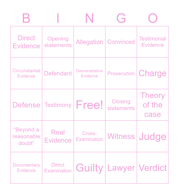 This bingo card has a free space and 24 words: Real Evidence, Direct Examination, Demonstrative Evidence, Documentary Evidence, Testimonial Evidence, Direct Evidence, Circumstantial Evidence, Opening statements, Closing statements, Cross-Examination, Prosecution, Defense, Witness, Judge, Defendant, Lawyer, Theory of the case, Allegation, Charge, Testimony, Verdict, “Beyond a reasonable doubt”, Convinced and Guilty.