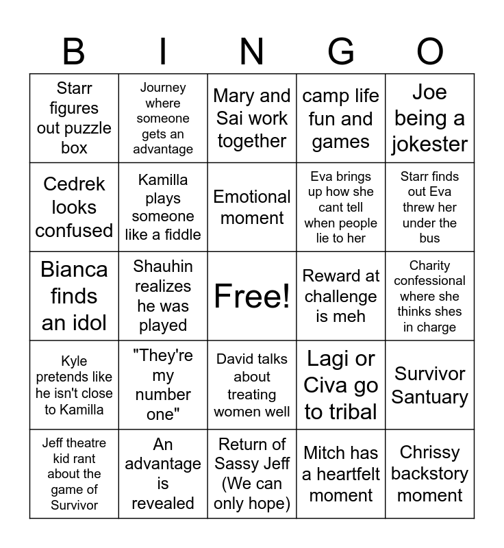 This bingo card has a free space and 24 words: "They're my number one", An advantage is revealed, Emotional moment, Jeff theatre kid rant about the game of Survivor, Joe being a jokester, Starr figures out puzzle box, Cedrek looks confused, Journey where someone gets an advantage, Reward at challenge is meh, David talks about treating women well, Eva brings up how she cant tell when people lie to her, Bianca finds an idol, Lagi or Civa go to tribal, Survivor Santuary, Kamilla plays someone like a fiddle, Mitch has a heartfelt moment, Charity confessional where she thinks shes in charge, Mary and Sai work together, Starr finds out Eva threw her under the bus, Shauhin realizes he was played, Chrissy backstory moment, Kyle pretends like he isn't close to Kamilla, camp life fun and games and Return of Sassy Jeff (We can only hope).