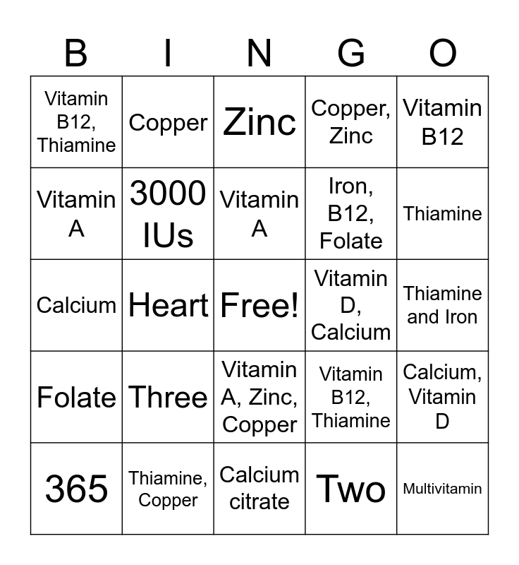 This bingo card has a free space and 24 words: Three, Thiamine, Copper, Vitamin A, 365, Vitamin B12, Vitamin B12, Thiamine, Vitamin A, Copper, Vitamin D, Calcium, Vitamin A, Zinc, Copper, Iron, B12, Folate, Calcium, Vitamin B12, Thiamine, Calcium, Vitamin D, 3000 IUs, Two, Thiamine and Iron, Zinc, Thiamine, Heart, Multivitamin, Folate, Copper, Zinc and Calcium citrate.