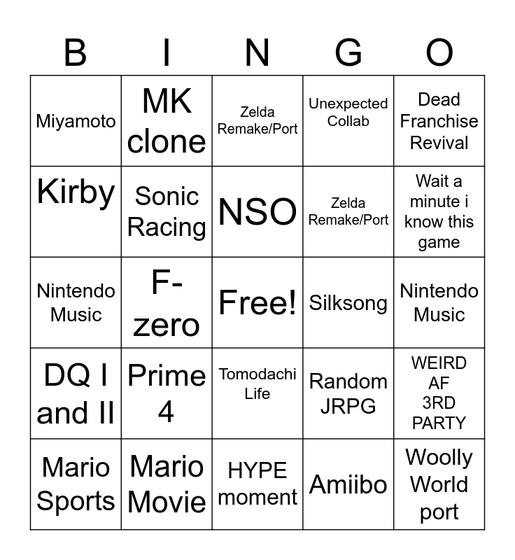 This bingo card has a free space and 24 words: Prime 4, Mario Movie, NSO, Mario Sports, Dead Franchise Revival, Miyamoto, Kirby, MK clone, Silksong, Tomodachi Life, Zelda Remake/Port, Nintendo Music, Random JRPG, WEIRD AF 3RD PARTY, Sonic Racing, Amiibo, Nintendo Music, Zelda Remake/Port, Wait a minute i know this game, F-zero, Woolly World port, DQ I and II, Unexpected Collab and HYPE moment.