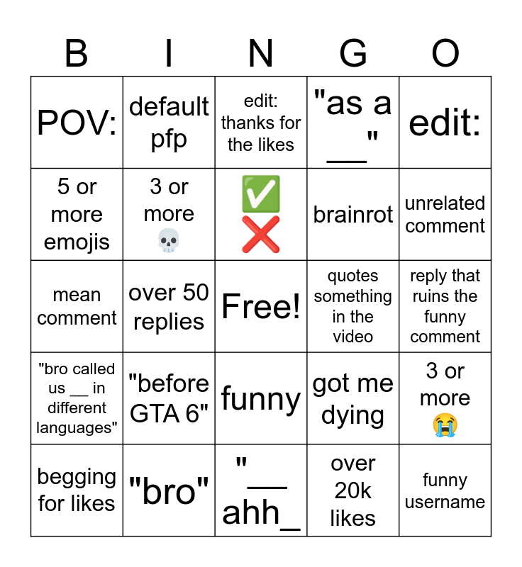 This bingo card has a free space and 24 words: "before GTA 6", "bro", ✅ ❌, begging for likes, edit:, POV:, 5 or more emojis, default pfp, quotes something in the video, funny, brainrot, mean comment, got me dying, 3 or more 😭, 3 or more 💀, over 20k likes, reply that ruins the funny comment, edit: thanks for the likes, unrelated comment, over 50 replies, funny username, "bro called us __ in different languages", "as a __" and "__ ahh_.