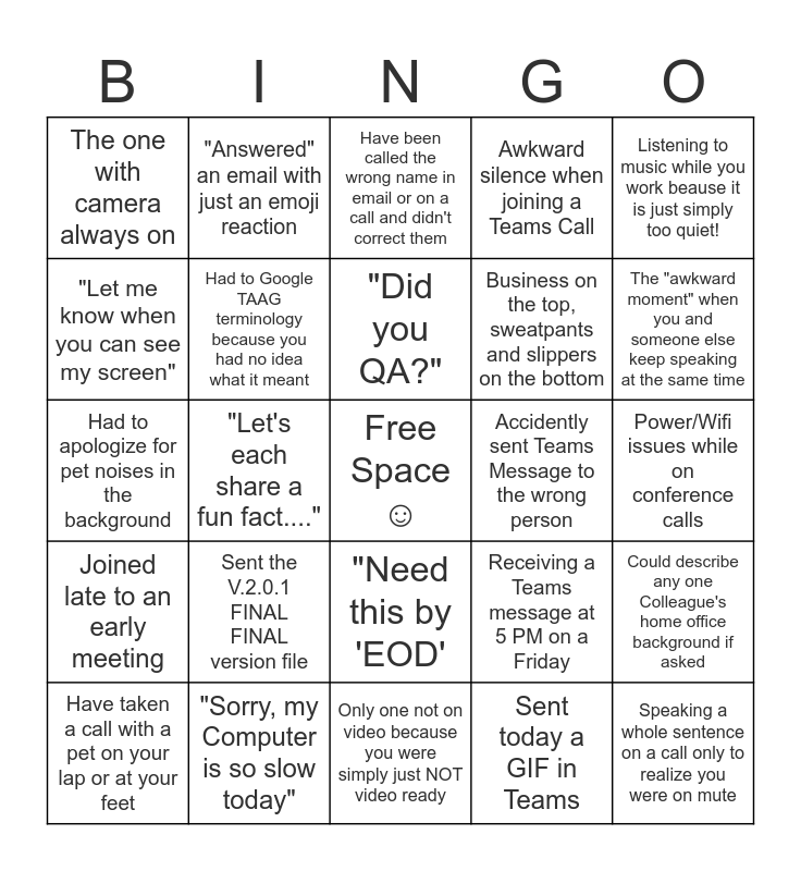 This bingo card has a free space and 34 words: It's been a long week.... it's only Tuesday, Happy Friday!, Sending an email to the wrong person in error., Accidently "replied all" to company wide email, Power/Wifi issues while on conference calls, "Let me know when you can see my screen", Had to Google TAAG terminology because you had no idea what it meant, Only one not on video because you were simply just NOT video ready, Business on the top, sweatpants and slippers on the bottom, Speaking a whole sentence on a call only to realize you were on mute, Had to apologize for pet noises in the background, "Answered" an email with just an emoji reaction, Sent today a GIF in Teams, Realizing you were unmuted the whole meeting, Joined late to an early meeting, "Let's each share a fun fact....", "Need this by 'EOD', Accidently sent Teams Message to the wrong person, Could describe any one Colleague's home office background if asked, Have taken a call with a pet on your lap or at your feet, "Sorry, my Computer is so slow today", "Sorry, forgot to share with audio", Awkward silence when joining a Teams Call, The "awkward moment" when you and someone else keep speaking at the same time, Had camera on and didn´t notice it, Sent the V.2.0.1 FINAL FINAL version file, Have been called the wrong name in email or on a call and didn't correct them, "How's the weather where you are...?", Listening to music while you work beause it is just simply too quiet!, The one with camera always on, "Hey Teeeam", "Did you QA?", Receiving a Teams message at 5 PM on a Friday and Double-checking you left the correct dates for your OOO.