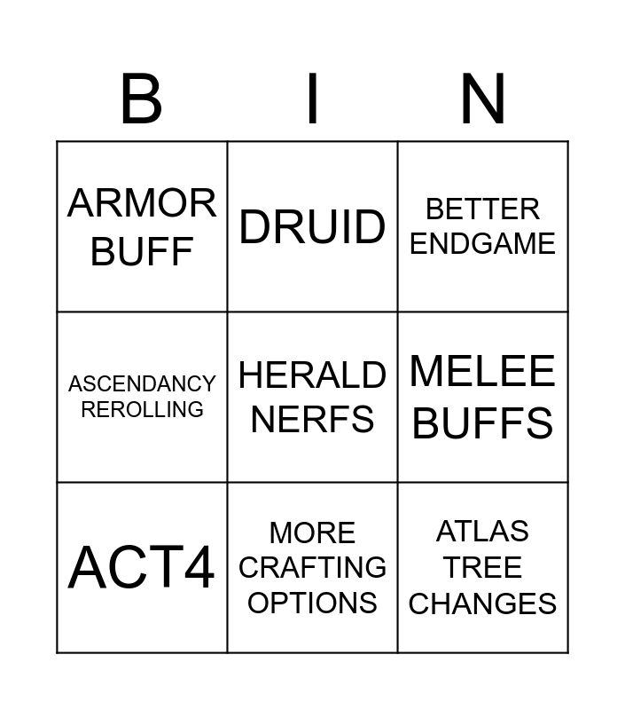 This bingo card has a free space and 8 words: MELEE BUFFS, BETTER ENDGAME, DRUID, ACT4, ARMOR BUFF, ATLAS TREE CHANGES, ASCENDANCY REROLLING and MORE CRAFTING OPTIONS.