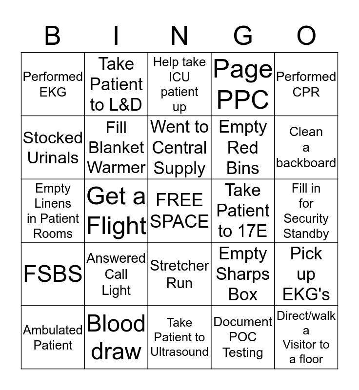This bingo card has a free space and 24 words: Answered Call Light, Blood draw, Went to Central Supply, Ambulated Patient, Performed CPR, Performed EKG, Stocked Urinals, Take Patient to L&D, Take Patient to 17E, Stretcher Run, Empty Red Bins, Empty Linens in Patient Rooms, Empty Sharps Box, Pick up EKG's, Fill Blanket Warmer, Document POC Testing, Fill in for Security Standby, Help take ICU patient up, Clean a backboard, Get a Flight, Direct/walk a Visitor to a floor, FSBS, Page PPC and Take Patient to Ultrasound.