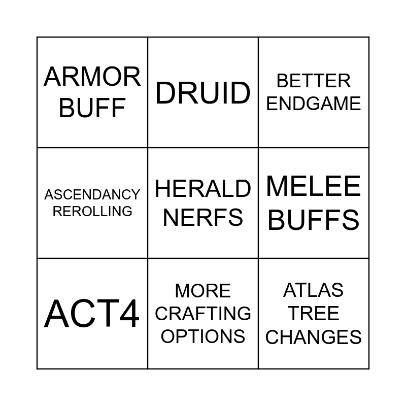 This bingo card has a free space and 8 words: MELEE BUFFS, BETTER ENDGAME, DRUID, ACT4, ARMOR BUFF, ATLAS TREE CHANGES, ASCENDANCY REROLLING and MORE CRAFTING OPTIONS.