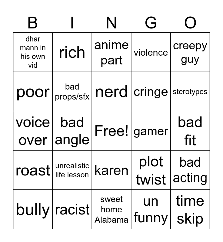 This bingo card has a free space and 24 words: unrealistic life lesson, racist, nerd, bully, creepy guy, dhar mann in his own vid, poor, rich, gamer, karen, cringe, voice over, plot twist, bad acting, bad props/sfx, un funny, bad fit, anime part, sterotypes, bad angle, time skip, roast, violence and sweet home Alabama.