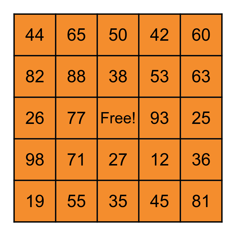 This bingo card has a free space and 24 words: 71, 55, 38, 19, 60, 44, 82, 65, 93, 27, 53, 26, 12, 36, 88, 45, 25, 50, 63, 77, 81, 98, 42 and 35.