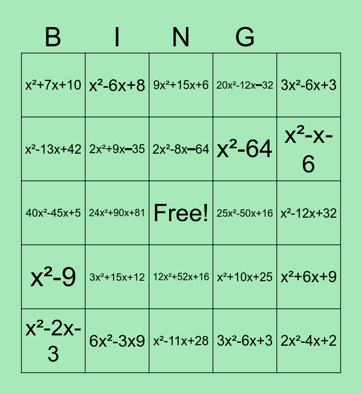 This bingo card has a free space and 44 words: 3x²+11x+6, 2x²-4x+2, 4x²-9, x²-2x-3, 4x²+8x+3, 3x²-6x+3, 9x²+15x+6, x²-5x+6, 3x²-6x+3, 6x²-3x9, 20x²-12x━32, 25x²-50x+16, 12x²+52x+16, 3x²+15x+12, 15x²-18x━24, x²-11x+28, 40x²+28x━24, 40x²-45x+5, x²+4x+4, x²-x-6, x²-6x+8, x²+5x+6, x²-9x+20, x²+7x+10, x²-3x━18, x²-12x+32, x²+10x+16, x²+8x+6, x²+10x+25, x²-9, x²-4, x²+6x+9, x²+10x+24, x²-49, 24x²+90x+81, x²-5x━14, 2x²+8x+6, 4x²+2x━12, 2x²-8x━64, x²-13x+42, x²-64, 12x²-2x━4, 2x²+9x━35 and 15x²+3x━12.