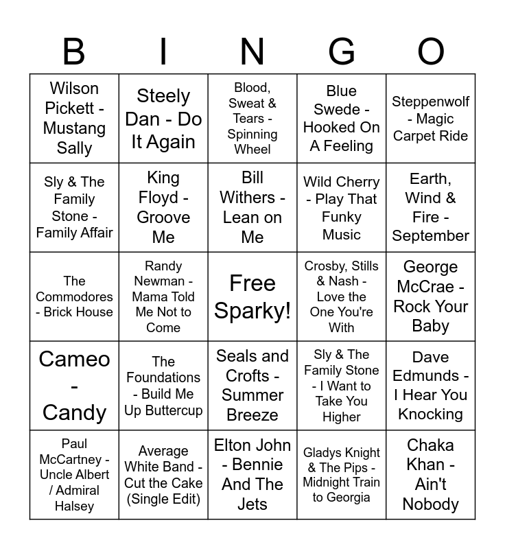This bingo card has a free space and 50 words: The Beatles - A Hard Day's Night, Chaka Khan - Ain't Nobody, Four Tops - Baby I Need Your Loving, Elton John - Bennie And The Jets, The Foundations - Build Me Up Buttercup, DJ 70's Party Mix - Can't Get Enough of Your Love Baby, Steely Dan - Do It Again, Creedence Clearwater Revival - Down On The Corner, Sly & The Family Stone - Family Affair, Ohio Players - Fire (Ohio Players), King Floyd - Groove Me, Blue Swede - Hooked On A Feeling, Dave Edmunds - I Hear You Knocking, Sly & The Family Stone - I Want to Take You Higher, Harold Melvin & The Blue Notes - If You Don't Know Me by Now (feat. Teddy Pendergrass), The Rolling Stones - Jumpin' Jack Flash, Bill Withers - Lean on Me, Crosby, Stills & Nash - Love the One You're With, War - Low Rider, Steppenwolf - Magic Carpet Ride, Randy Newman - Mama Told Me Not to Come, Gladys Knight & The Pips - Midnight Train to Georgia, Wilson Pickett - Mustang Sally, Wild Cherry - Play That Funky Music, Aretha Franklin - Respect, Elton John - Rocket Man (I Think It's Going To Be A Long, Long Time), Earth, Wind & Fire - September, Ohio Players - Skin Tight, Blood, Sweat & Tears - Spinning Wheel, Seals and Crofts - Summer Breeze, The Guess Who - American Woman, Looking Glass - Brandy (You're a Fine Girl), Rose Royce - Car Wash, Harry Nilsson - Coconut, Average White Band - Cut the Cake (Single Edit), The Monkees - Daydream Believer, Pockets - Come Go With Me, War - Slippin' Into Darkness, The O'Jays - Back Stabbers, George McCrae - Rock Your Baby, Tony Orlando - Knock Three Times, Fleetwood Mac - Dreams (Live at Palais du Sport, Paris, France, 6/14/1980), Janis Joplin - Me and Bobby McGee, Janis Joplin - Me and Bobby McGee, Paul McCartney - Uncle Albert / Admiral Halsey, The Commodores - Brick House, Heatwave - Always and Forever, The Staple Singers - I'll Take You There, Cameo - Candy and Lakeside - Fantastic Voyage.