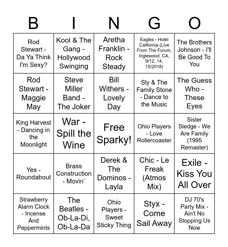 This bingo card has a free space and 48 words: Nina Simone - Feeling Good, DJ 70's Party Mix - Ain't No Stopping Us Now, DJ 70's Party Mix - Rappers Delight, Ohio Players - Sweet Sticky Thing, Brass Construction - Movin’, The Dramatics - Whatcha See Is Whatcha Get, Kool & The Gang - Hollywood Swinging, Three Dog Night - Mama Told Me (Not To Come), Rod Stewart - Maggie May, Dawn - Tie a Yellow Ribbon Round the Ole Oak Tree (feat. Tony Orlando), Steve Miller Band - The Joker, Eagles - Hotel California (Live From The Forum, Inglewood, CA, 9/12, 14, 15/2018), Exile - Kiss You All Over, Chic - Le Freak (Atmos Mix), Village People - Y.M.C.A., Peaches & Herb - Shake Your Groove Thing, Bill Withers - Lovely Day, Ohio Players - Love Rollercoaster, Stevie Wonder - You Are The Sunshine Of My Life, The Brothers Johnson - I'll Be Good To You, War - Spill the Wine, Styx - Come Sail Away, Rod Stewart - Da Ya Think I'm Sexy?, Sly & The Family Stone - Dance to the Music, The Young Rascals - Good Lovin' (Single Version), The Guess Who - These Eyes, Strawberry Alarm Clock - Incense And Peppermints, Janis Joplin - Me and Bobby McGee, Derek & The Dominos - Layla, Yes - Roundabout, Curtis Mayfield - Superfly, Isaac Hayes - Theme From Shaft (Remastered 2009), Stealers Wheel - Stuck In The Middle With You, Jim Croce - Bad, Bad Leroy Brown, The Beatles - Ob-La-Di, Ob-La-Da, Aretha Franklin - Chain of Fools, Simon & Garfunkel - Bye Bye Love, Sister Sledge - We Are Family (1995 Remaster), America - Tin Man, America - Ventura Highway (2006 Remaster), Jackson Browne - Doctor My Eyes, Spinners - I'll Be Around, Aretha Franklin - Rock Steady, Lou Reed - Walk On the Wild Side, King Harvest - Dancing in the Moonlight, The Main Ingredient - Everybody Plays the Fool, LTD - Love Ballad (Re-Recorded / Remastered) and Curtis Mayfield - Pusherman.