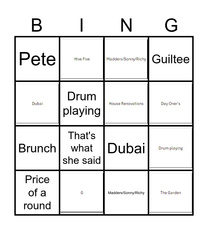 This bingo card has 16 images and 16 words: House/Garden Renovations, Dubai, I remember my first beer, Hive Five, Whaka Whaka, Day Oner's, Madders/Sonny/Richy, Amy, Price of a round, Guiltee, Brunch, Drum playing, Pete, Dilly Dilly, G and That's what she said.