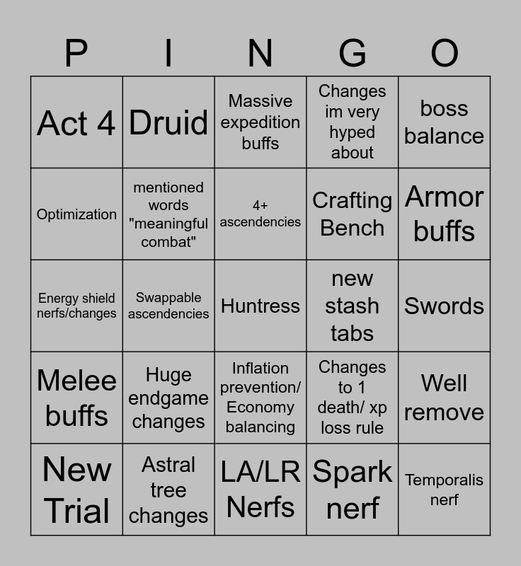 This bingo card has a free space and 24 words: Huge endgame changes, Astral tree changes, 4+ ascendencies, New Trial, boss balance, Act 4, Optimization, Druid, new stash tabs, Inflation prevention/ Economy balancing, Crafting Bench, Energy shield nerfs/changes, Changes to 1 death/ xp loss rule, Well remove, mentioned words "meaningful combat", Spark nerf, Swords, Massive expedition buffs, Armor buffs, Swappable ascendencies, Temporalis nerf, Melee buffs, Changes im very hyped about and LA/LR Nerfs.