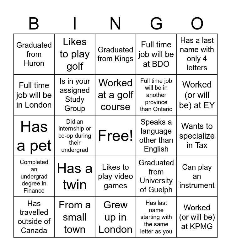 This bingo card has a free space and 31 words: Grew up in London, Was part of a school club, Did an internship or co-op during their undergrad, Did an international exchange, Graduated from Huron, Graduated from Kings, Is in your assigned Study Group, Graduated from University of Guelph, Speaks a language other than English, Has last name starting with the same letter as you, Wants to specialize in Tax, Worked (or will be) at KPMG, Worked (or will be) at Deloitte, Worked (or will be) at PwC, Worked (or will be) at EY, Graduated from Dalhousie, Can play an instrument, Has a twin, Completed an undergrad degree in Finance, Likes to play video games, Has a last name with only 4 letters, Has a birthday during the GDip academic term, Has travelled outside of Canada, Likes to play golf, Full time job will be in another province than Ontario, Full time job will be in London, Full time job will be at BDO, Has a pet, From a small town, Worked at a golf course and Will be working for an insurance company.