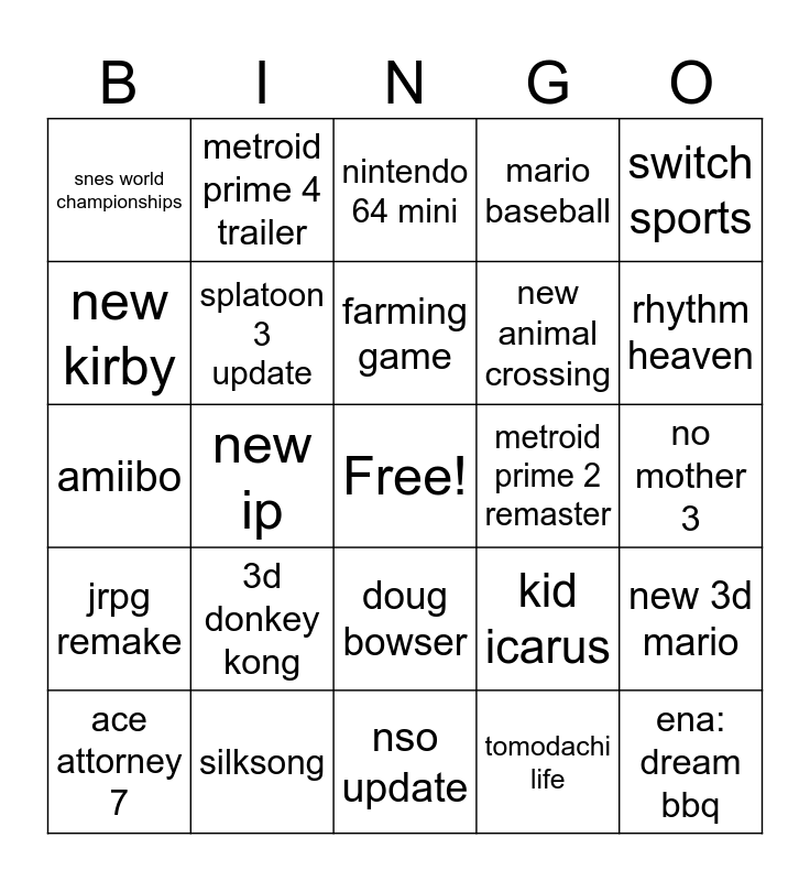 This bingo card has a free space and 24 words: 3d donkey kong, silksong, farming game, ace attorney 7, switch sports, snes world championships, new kirby, metroid prime 4 trailer, metroid prime 2 remaster, doug bowser, new animal crossing, amiibo, kid icarus, new 3d mario, splatoon 3 update, tomodachi life, no mother 3, nintendo 64 mini, rhythm heaven, new ip, ena: dream bbq, jrpg remake, mario baseball and nso update.