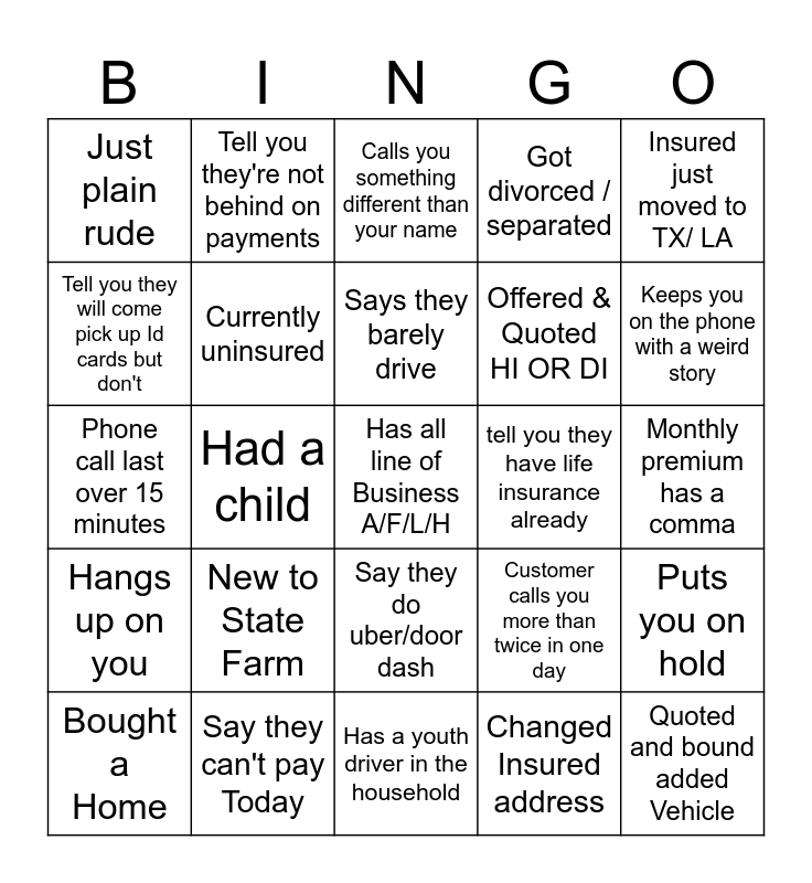 This bingo card has a free space and 24 words: Bought a Home, New to State Farm, Says they barely drive, Changed Insured address, Insured just moved to TX/ LA, Just plain rude, Tell you they're not behind on payments, Calls you something different than your name, tell you they have life insurance already, Monthly premium has a comma, Phone call last over 15 minutes, Currently uninsured, Customer calls you more than twice in one day, Puts you on hold, Tell you they will come pick up Id cards but don't, Say they can't pay Today, Has a youth driver in the household, Got divorced / separated, Keeps you on the phone with a weird story, Hangs up on you, Had a child, Say they do uber/door dash, Offered & Quoted HI OR DI and Quoted and bound added Vehicle.